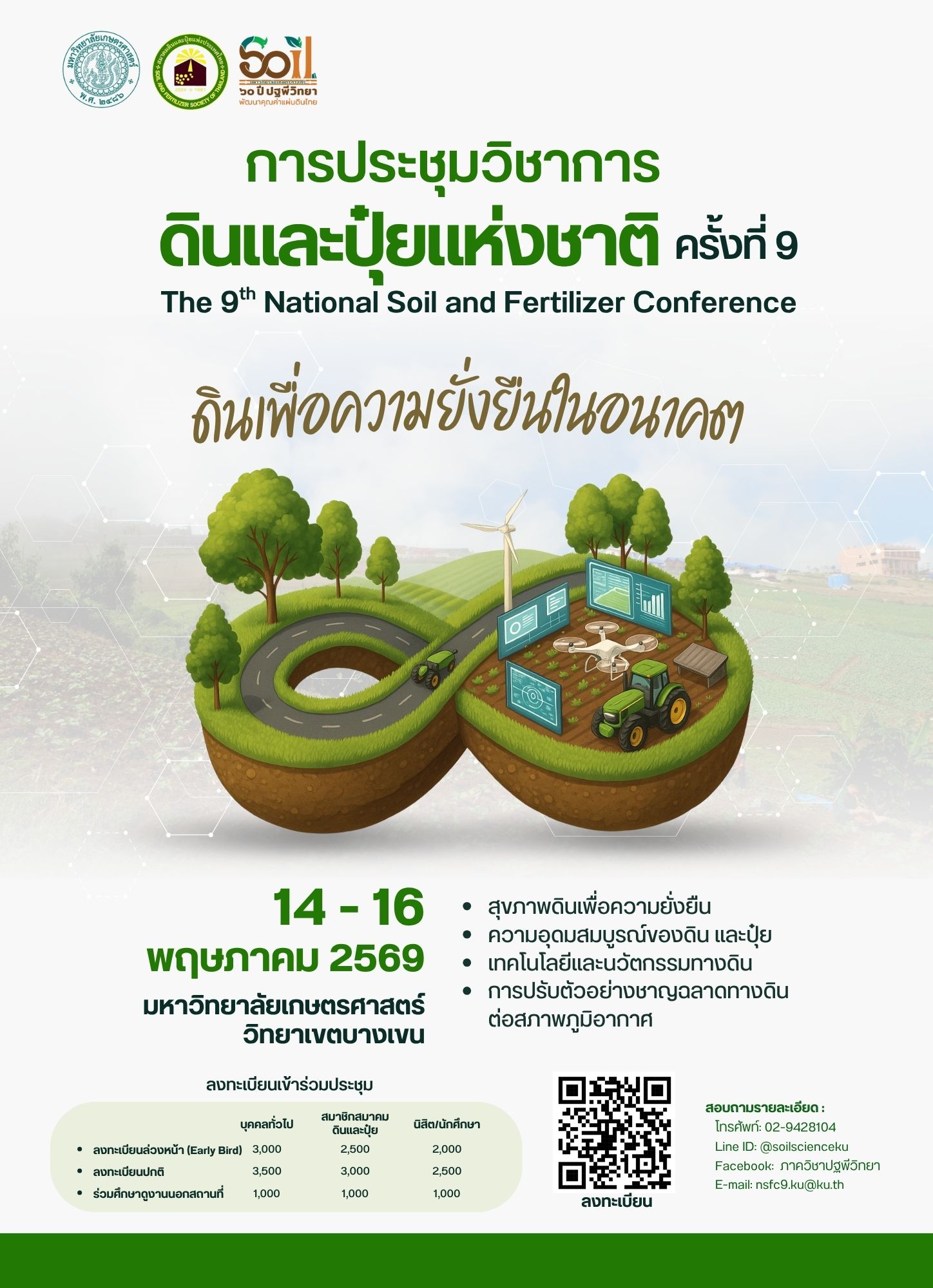 ดินเป็นพื้นฐานที่สำคัญของสิ่งมีชีวิตในโลก มีส่วนสำคัญต่อการผลิตพืช ความมั่นคงทางอาหารของมนุษย์ การรักษาสิ่งแวดล้อม และการบรรเทาการเปลี่ยนแปลงสภาพภูมิอากาศ อย่างไรก็ตามทรัพยากรดินกำลังเสื่อมโทรมลงจากสารพิษและการใช้ประโยชน์ดินอย่างไม่เหมาะสม ซึ่งส่งผลกระทบต่อสุขภาพและความยั่งยืนของสิ่งแวดล้อม ดังนั้น การจัดการดินและฟื้นฟูทรัพยากรดินให้ยั่งยืนทั้งทางการเกษตรและสิ่งแวดล้อมจึงเป็นเรื่องสำคัญและเร่งด่วน การประชุมวิชาการดินและปุ๋ยแห่งชาติ ครั้งที่ 9 จะจัดขึ้นที่ มหาวิทยาลัยเกษตรศาสตร์ กรุงเทพฯ เพื่อเฉลิมฉลอง ครบรอบ 60 ปี ภาควิชาปฐพีวิทยา มหาวิทยาลัยเกษตรศาสตร์ การประชุมครั้งนี้เป็นเวทีแลกเปลี่ยนความรู้และนวัตกรรมระหว่างนักวิจัย นักวิชาการ นิสิต และผู้ประกอบการด้านปุ๋ยและการเกษตร โดยเชื่อมโยงบทบาทของดินในการบรรลุ เป้าหมายการพัฒนาอย่างยั่งยืน (Sustainable Development Goals – SDGs) ที่กำหนดโดย องค์การสหประชาชาติ (UN) โดยเน้น 2 เป้าหมายหลัก คือ ความมั่นคงด้านอาหาร (SDG 2) ผ่านการพัฒนาผลผลิตทางการเกษตร และ การปฏิบัติอย่างเร่งด่วนเพื่อต่อสู้กับการเปลี่ยนแปลงสภาพภูมิอากาศ (SDG 13) ผ่านมาตรการกักเก็บคาร์บอนในดินและการลดก๊าซเรือนกระจกจากระบบดิน โปรแกรมการประชุมแบ่งออกเป็น 4 หัวข้อหลัก: