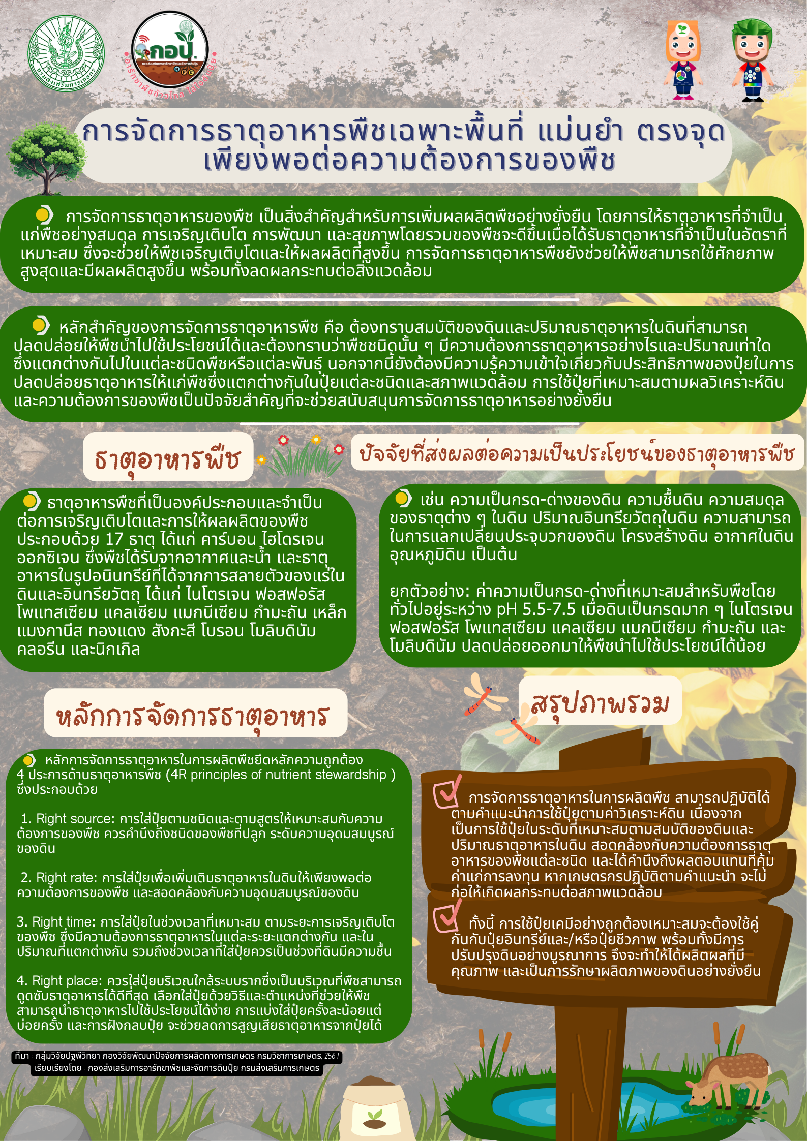 หลักสำคัญของการจัดการธาตุอาหารพืช คือ ต้องทราบสมบัติของดินและปริมาณธาตุอาหารในดินที่สามารถปลดปล่อยให้กับพืชนำไปใช้ประโยชน์ได้ และต้องทราบว่าพืชชนิดนั้น ๆ มีความต้องการธาตุอาหารอย่างไรและปริมาณเท่าใด ซึ่งแตกต่างกันไปในแต่ละชนิดพืชหรือแต่ละพันธุ์ นอกจากนี้ยังต้องมีความรู้ความเข้าใจเกี่ยวกับประสิทธิภาพของปุ๋ยในการปลดปล่อยธาตุอาหารให้แก่พืชซึ่งแตกต่างกันในปุ๋ยแต่ละชนิดและสภาพแวดล้อม การใช้ปุ๋ยที่เหมาะสมตามผลวิเคราะห์ดินและความต้องการของพืชเป็นปัจจัยสำคัญที่จะช่วยสนับสนุนการจัดการธาตุอาหารอย่างยั่งยืน